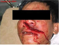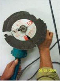 Um trabalhador na Indonésia executava um corte em uma telha de alumínio, utilizando um disco de corte, o disco quebrou, e arremessou pedaços longe e um desses pedaços o atingiu causando ferimento sério na sua face. Após o atendimento inicial foi levado para o hospital e ficou hospitalizado por aproximadamente duas semanas.Utilização inadequada da ferramenta